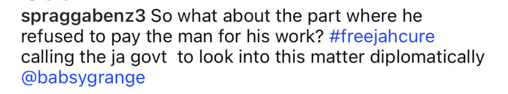 On Instagram, Spragga shared a headline about Jah Cure’s incarceration with the caption: “So what about the part where he refused to pay the man for his work? #freejahcure calling the Ja govt to look into this matter diplomatically @babsygrange.”